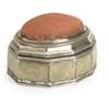 silver, walnut and shagreen, facetted oval form, the cover with domed pin cushion in original pink corduroy material enclosed by a shaped and facetted border with rope-twist band, the base with shagreen panels enclosed by shaped bands with corresponding rope-twist bands, stamped mark to base 'Edward Spencer DEL'