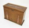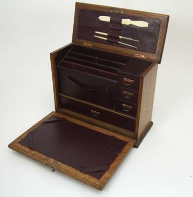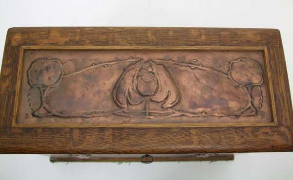of retangular outline with hinged lid and fall, the lid inlaid with copper panel repoussé decorated with stylised trees, the fall with decorative copper hinges, fitted leather interior