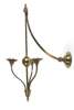 each with curved wall bracket, suspending a square and round section column with sphere spacer and moulded finial and issuing three curved branches with broad drip trays and three prongs for candles (2)