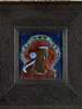 the square copper panel repousse decorated with the head of a girl and decorated with coloured enamels, bears initials 'JCP', stained oak frame