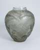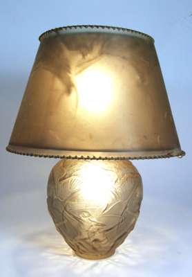 frosted, clear and grey stained glass, converted to a lamp, with removable parchment shade painted with flying birds, etched script mark 'R. Lalique, France No. 893'