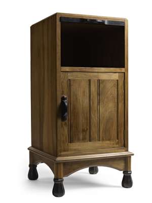 inlaid with yew banding and having carved ebony handles and legs, the square inlaid top above a slide and open shelf, above a single panelled door enclosing a single shelf and raised on faceted baluster shaped legs