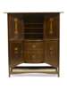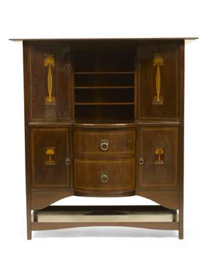 the overhanging cornice above central open shelves flanked by cupboards inlaid with stylised plant forms, the base with semi-bowed top above two drawers flanked by two further inlaid doors above a platform stretcher