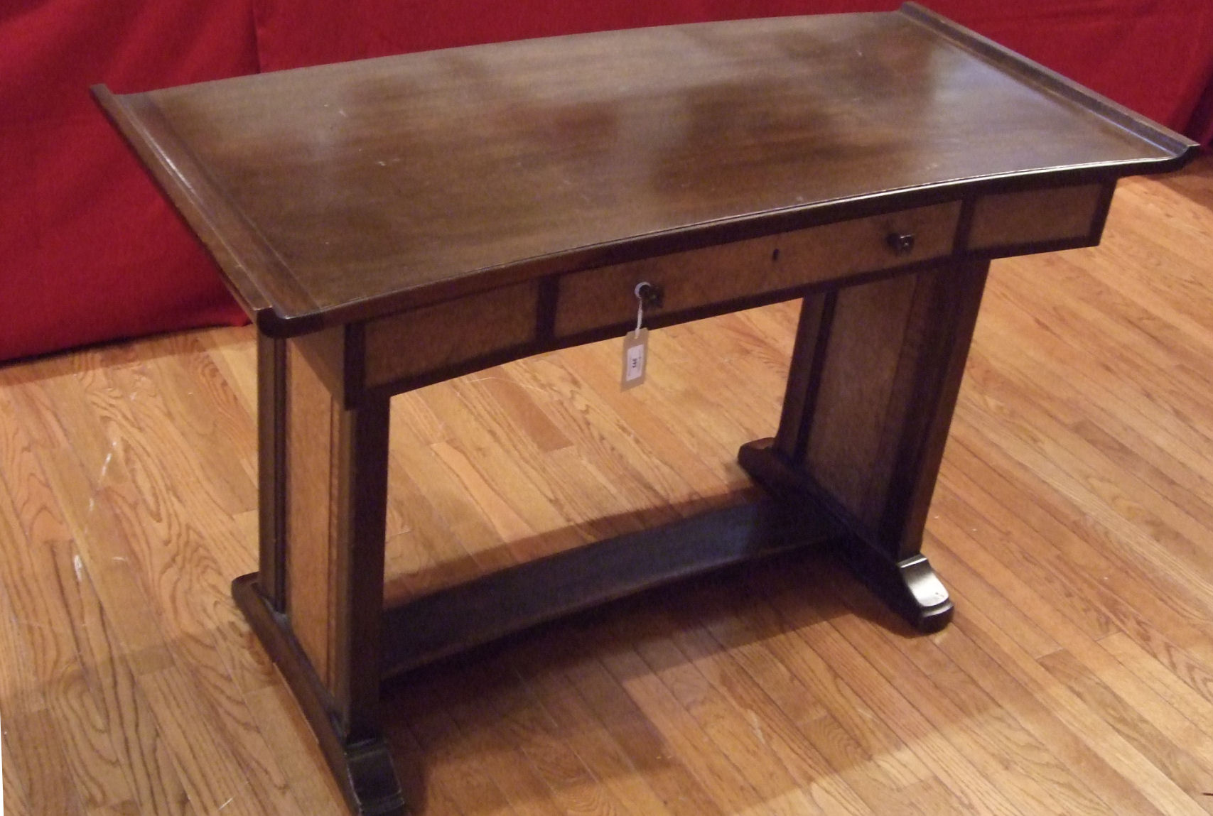 the curved dished top above burr panelled single drawer on burr-panelled supports linked by a stretcher, stamped maker's mark