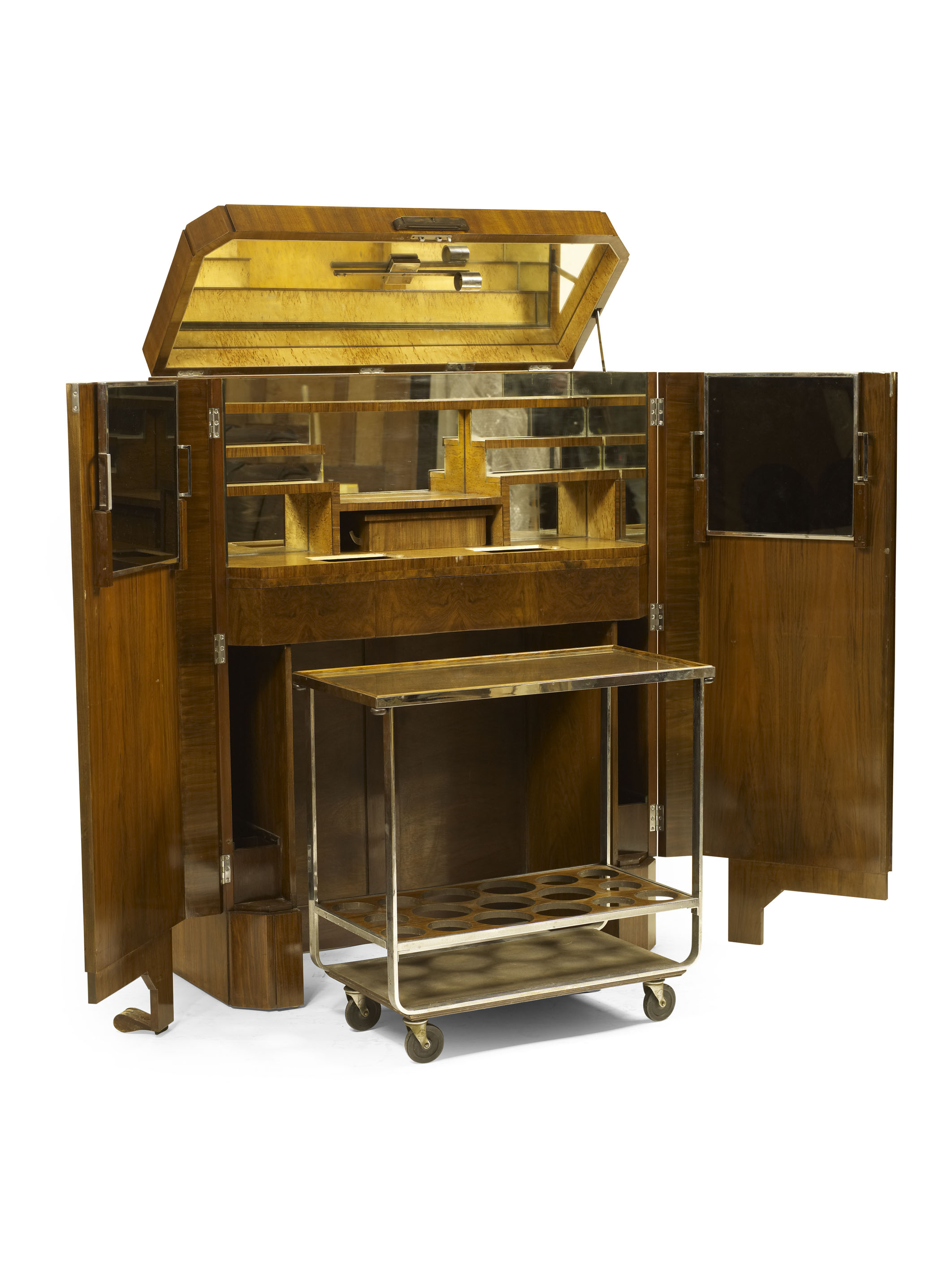the rectangular hinged top above twin doors, enclosing a mirrored and chrome mounted interior, fitted for cocktails and enclosing a separate drinks trolley and two trays