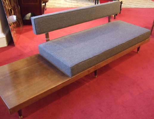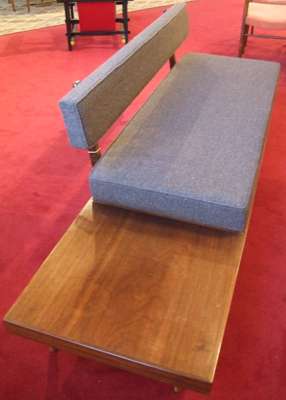 AMBOYNA WOOD SOFA AND TABLE, 1960S