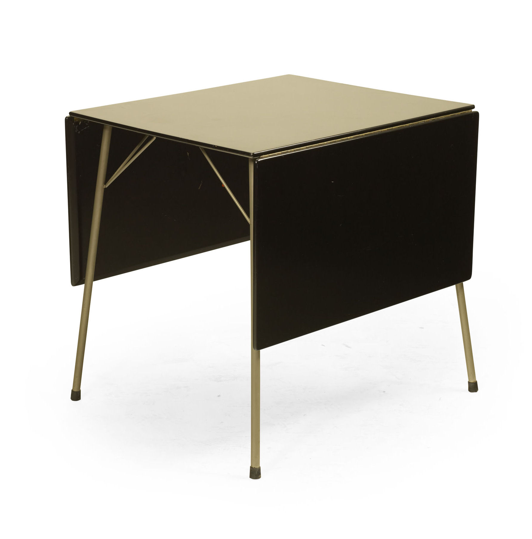each with black lacquered tops on chromium plated legs with bracket supports