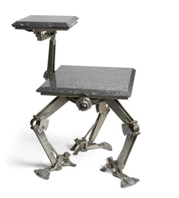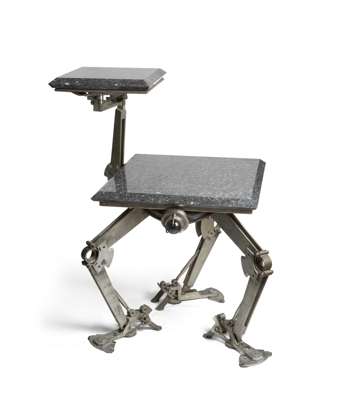 the square black granite top with canted edges above three 'hinged' legs, with inset glass lights, supporting an adjustable hinged arm with further granite tier above