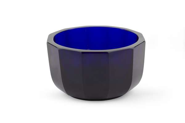the circular blue glass body with facetted sides, etched mark, 17cm across; A FACETTED BLUE GLASS VASE, AFTER JOSEF HOFFMANN, 9.5cm high; and a FACETTED PALE AMETHYST GLASS VASE, AFTER JOSEF HOFFMANN, baluster form, 15cm high (3)