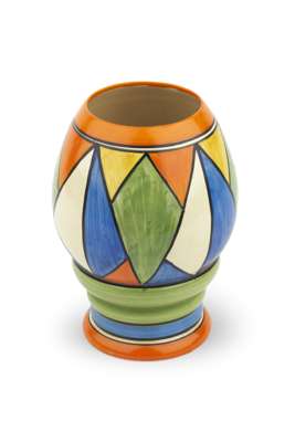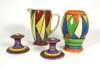 painted with coloured enamels, printed marks, 20cm high; and a CLARICE CLIFF 'BIZARRE' JUG, painted with coloured enamels, printed marks, 20cm high; and A PAIR OF CLARICE CLIFF 'BIZARRE' CANDLESTICKS, painted with coloured enamels, printed and painted marks, 8cm high (4)