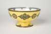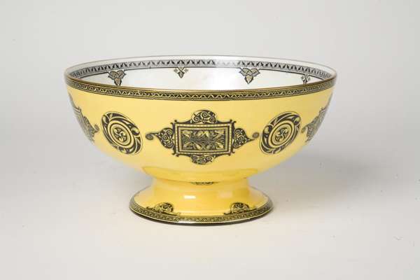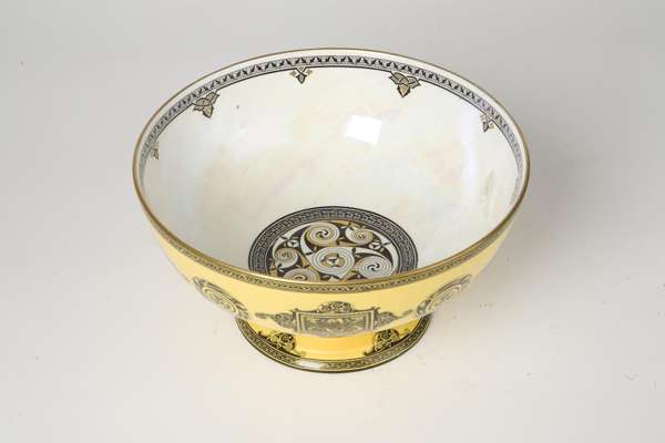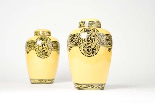 printed with Celtic motifs on a yellow ground, printed marks, 24cm high; and a matching bowl, 27cm across (3)