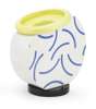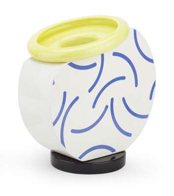 with yellow glazed inverted rim and flattened circular body, black plinth base, printed mark 'Memphis/ Milano/ Made in Italy by Flavia Montelupo F.no/ designed by Martine Bedin'