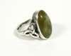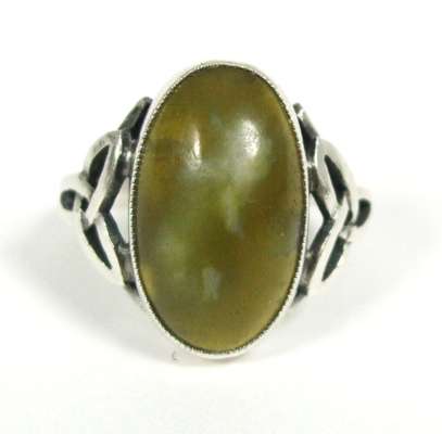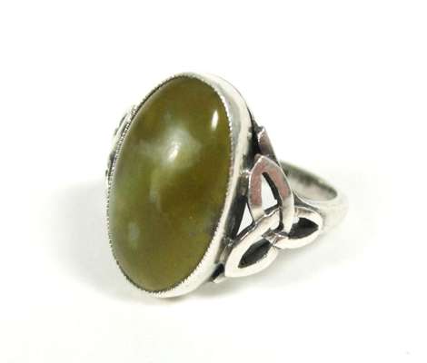 marked AR, IONA, the oval cabochon Iona marked collet set with applied pierced Celtic knot work to shoulders and simple shank