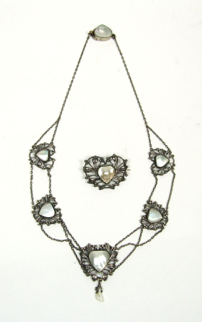 unmarked, the necklace formed of five graduated panels of foliate wreaths with heart shaped mother of pearl set to centre, the pendant drop with baroque mother of pearl details, the brooch similarly formed (2)