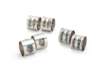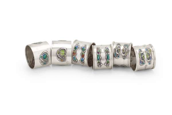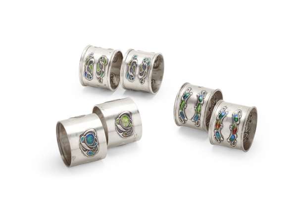 comprising a pair of plain bands, each with three embossed stylised foliate motifs, set with green and blue enamels, 4.8cm diameter, 3.7cm high; and two further pairs, each with moulded bands, embossed with three pairs of stylised plant motifs set with coloured enamels, 5cm diameter, 3.7cm high, all bear inscription 'C/ 1878-1903', hallmarked Birmingham 1903, within fitted box (6)