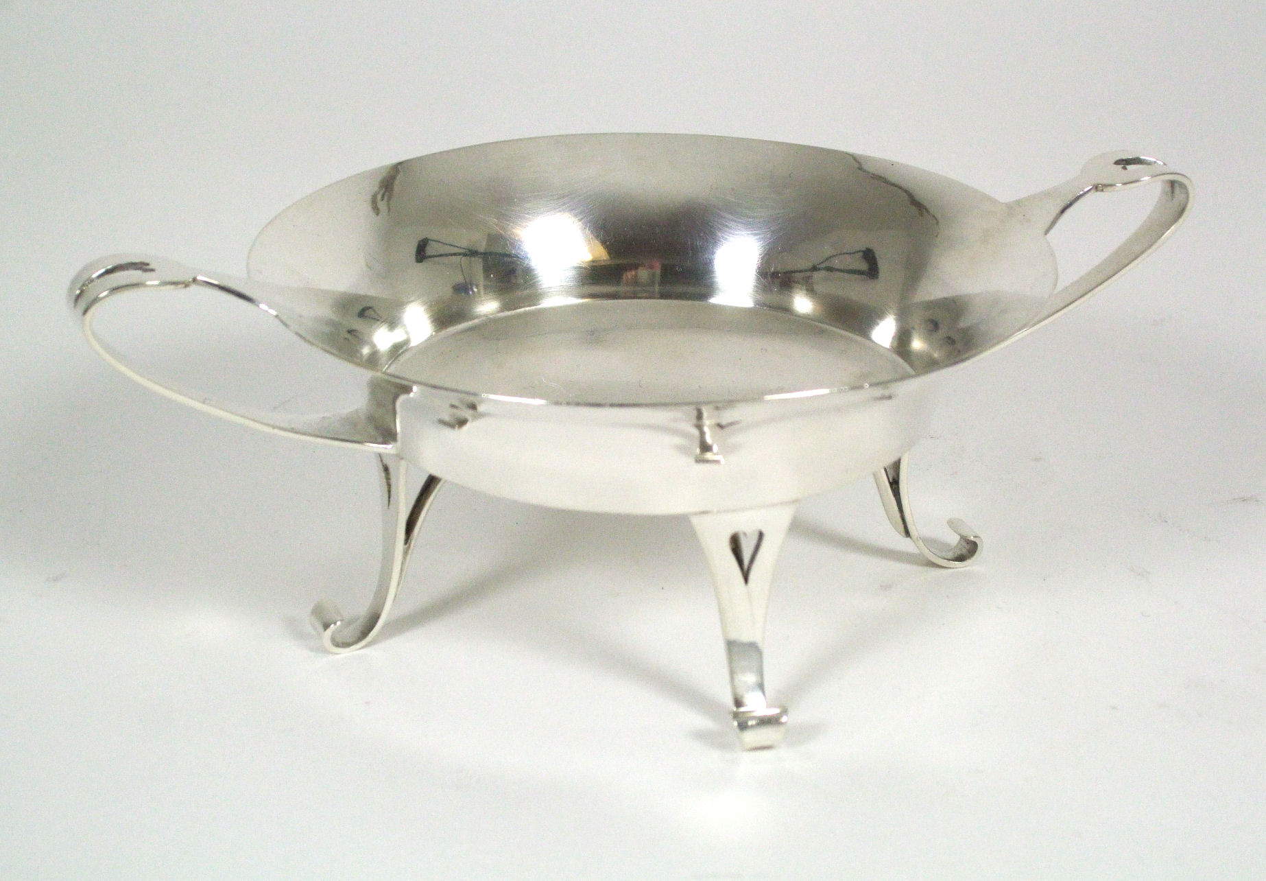 of circular form with twin handles pierced with heart and raised on corresponding pierced scroll feet, hallmarked Sheffield 1910