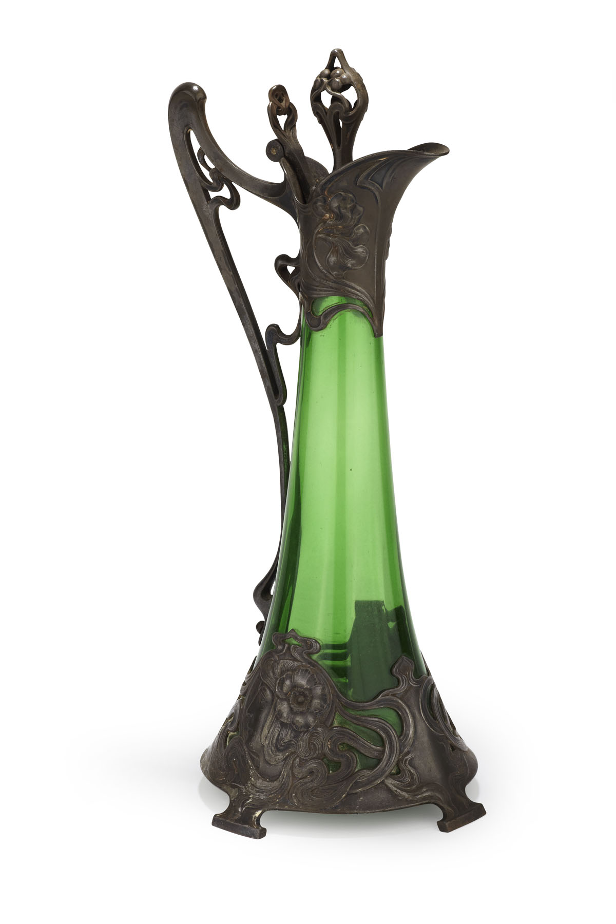 with tapering green glass body, the mounts cast with Art Nouveau maidens and flowering whiplash foliage, stamped marks