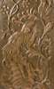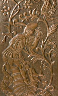 with reeded mahogany frame enclosing three repousse decorated panels depicting St George slaying the dragon, Daniel and the lion and a central panel of flowering foliage with further panels above bearing the legend 'To Be Is More Than To Do'