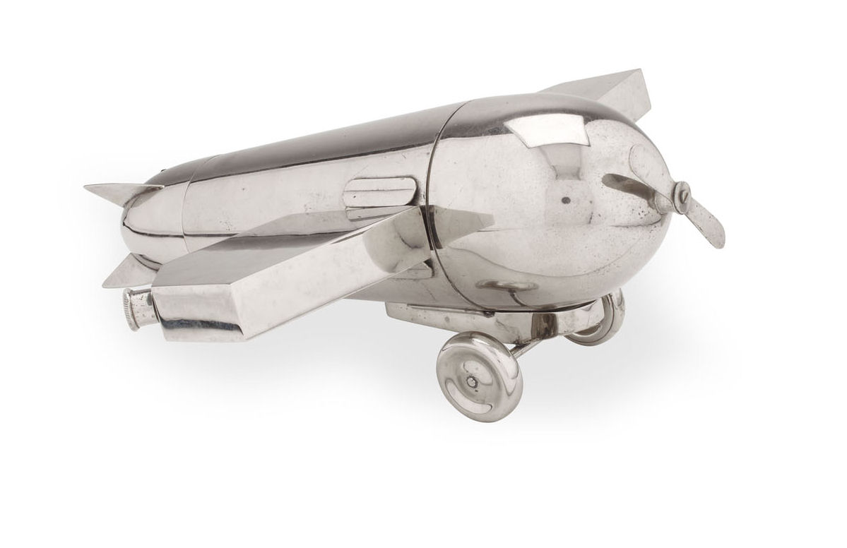 the fuselage containing a screw top flask, cocktail shaker with strainer, four 'tot' cups, and funnel, the undercarriage containing four stirring spoons, the 'wings'formed as removable hip flasks and the tail containing a corkscrew, stamped manufacturer's marks 'DRGM 89438' and 'J.A. Henckels, Twin Works, Solinsen, Germany'
