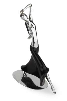 chromed metal and ebonised wood, depicting a dancing topless girl in a long flowing skirt raised on an oval flat base, unmarked