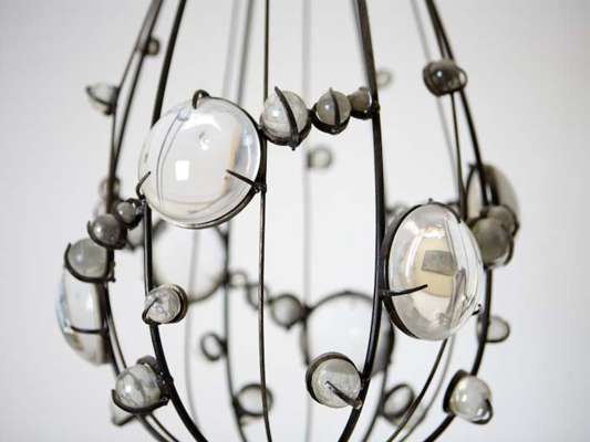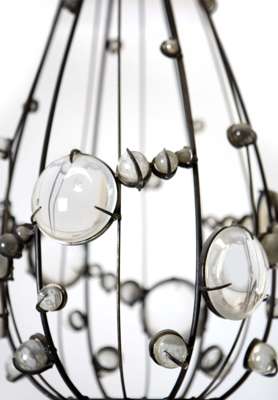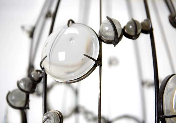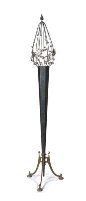 the open work elliptical shade set with glass orbs above a tapering faceted column on curved supports terminating in disc feet
