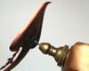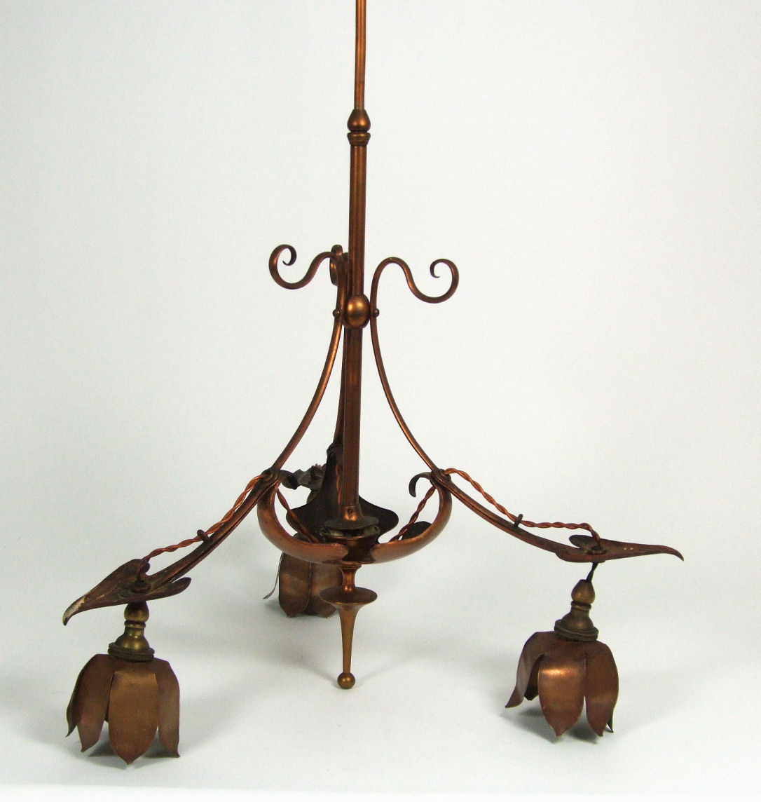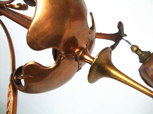 the central column with three curved branched with leaf terminals, supporting hanging leaf shades