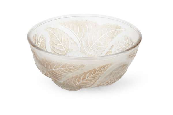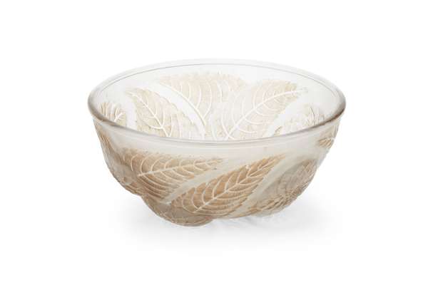 frosted glass with original brown staining, moulded with flowers and foliage, wheel etched mark 'R, Lalique, France'
