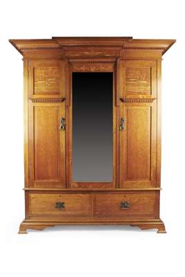 with marquetry inlaid panels depicting waterlilies, comprising a three door wardrobe, with projecting cornice and with two drawers below, 176cm wide, 211cm high, 68cm deep; A DRESSING CHEST, with swing mirror above two short over two long drawers, 127cm wide, 157cm high, 51cm deep; A PAIR OF DOUBLE BED ENDS, 145cm wide; and A POT CUPBOARD, 41cm wide (4)