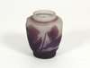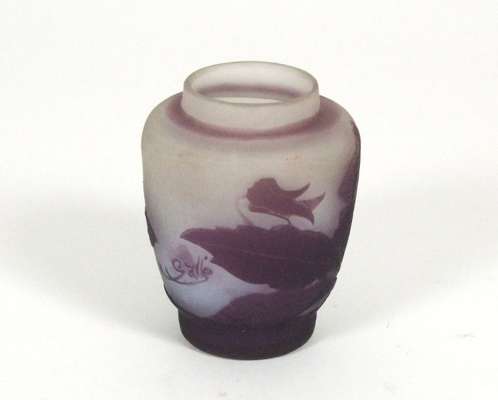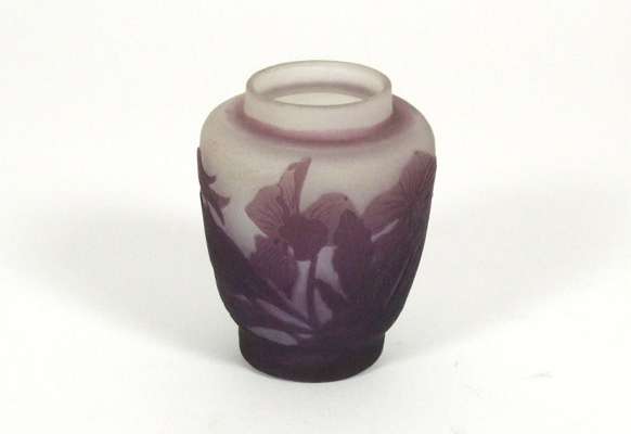 of ovoid form, the grey glass body overlaid with purple and acid etched with pansies, cameo signature 'Galle', bears original paper label