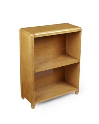fitted with a single shelf and decorated with reeding to the angles, bears label 'This set of The Encyclopaedia Britannica in it's bookcase of English Sycamore was issued to celebrate the coronation of George VI, 12th May 1937./ Bookcase designed and made by Betty Joel, Knightsbridge'