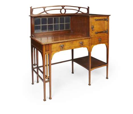 the pierced superstructure with leaded and glazed panel and asymmetric single cupboard door, above a writing surface and two drawers and standing on slender supports with pad feet, linked by stretchers and an undertier
