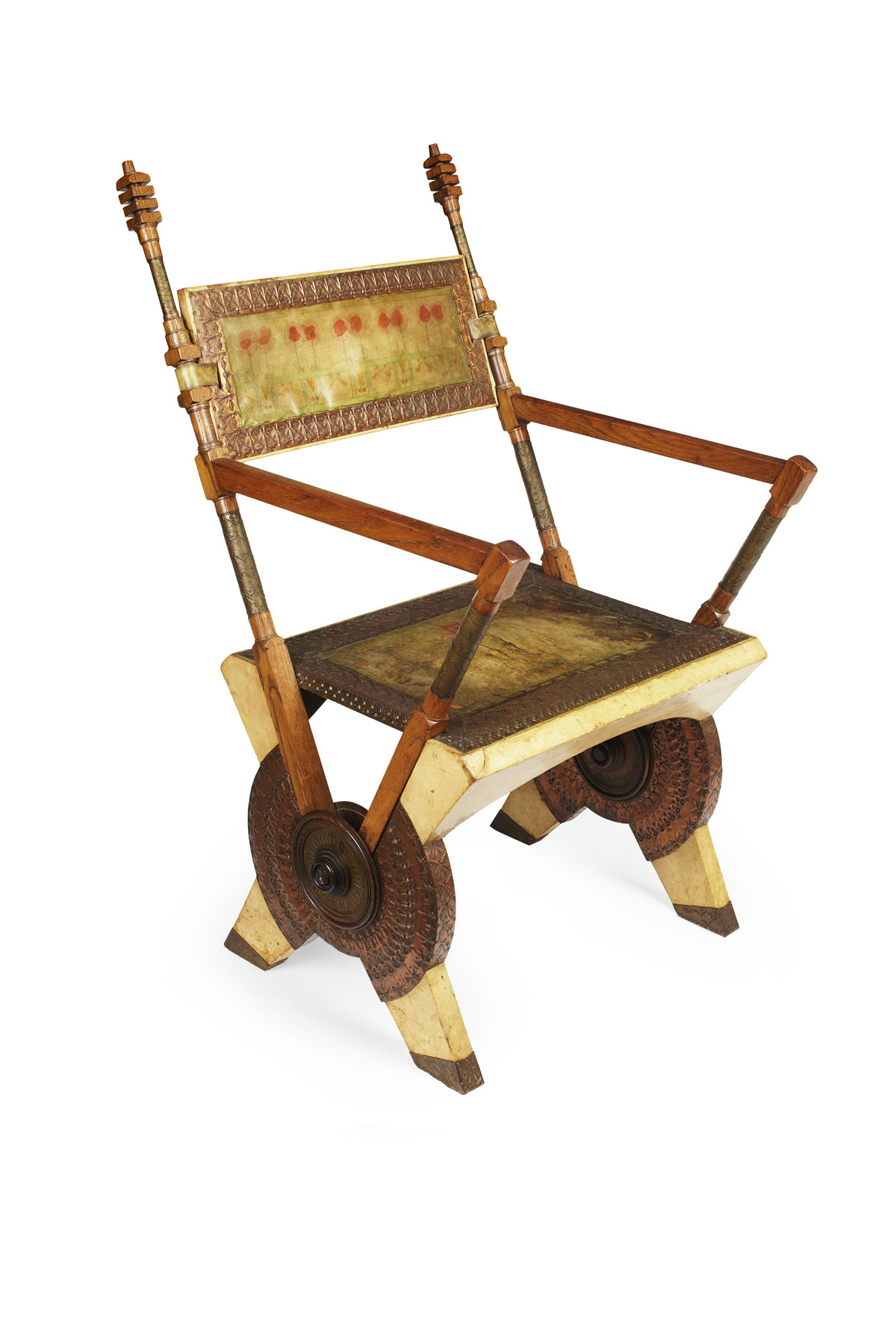 with embossed copper decorations, the rectangular back covered in vellum and painted with a frieze of poppies, supported by turned uprigghts on a studded vellum seat on crossed vellum covered supports