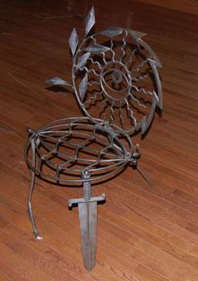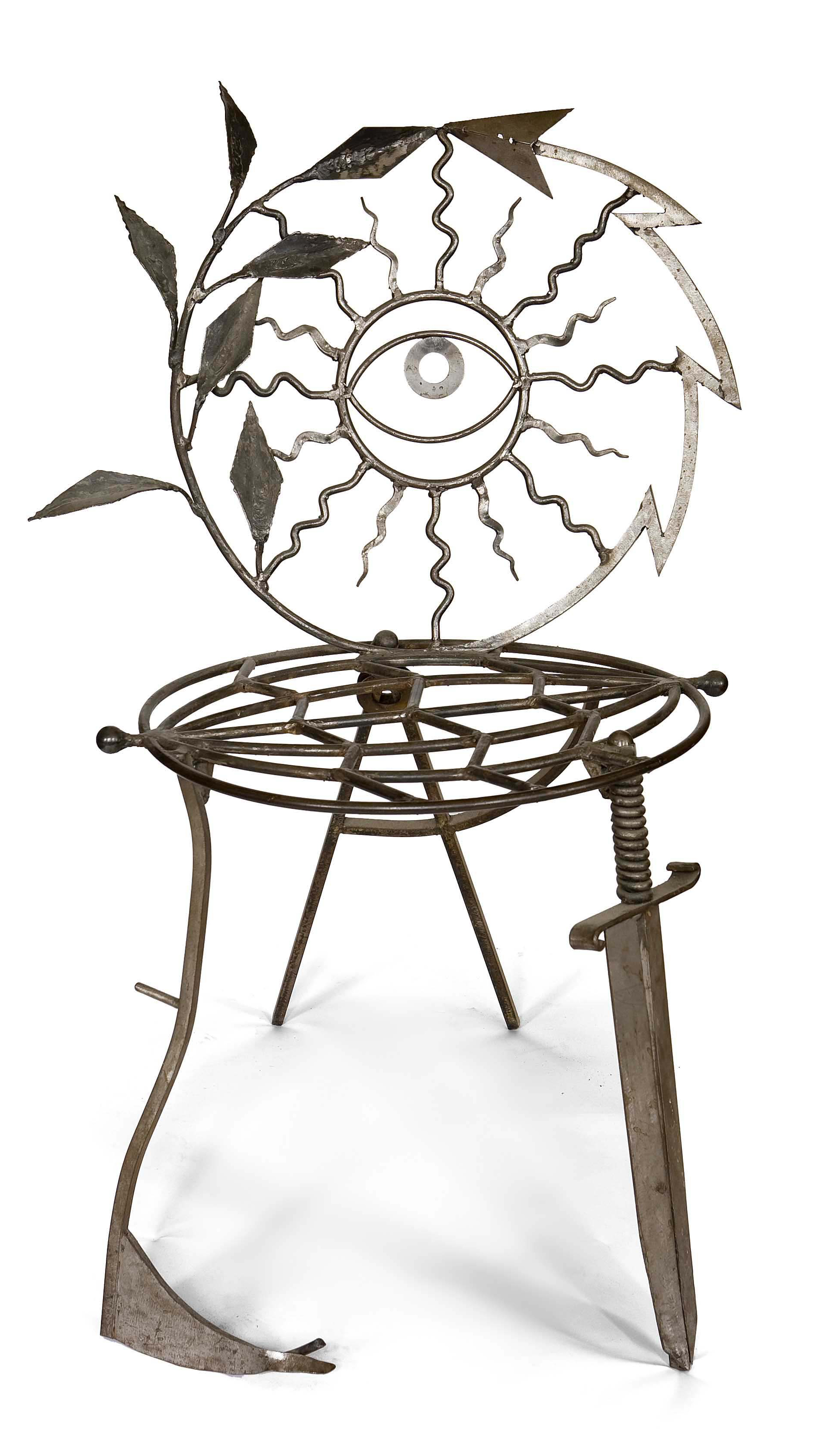 the circular back with applied garland and central eye motif above an openwork seat with scythe and sword supports