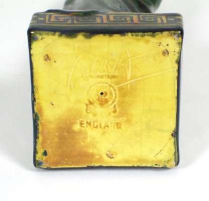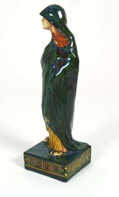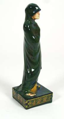 modelled as a classical female figure in pleated dress and flowing cloak raised on a plinth with Greek key frieze, impressed mark, incised initials