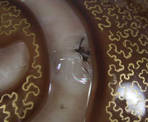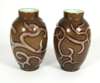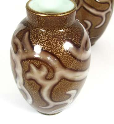 each of slender ovoid form in brown glass with air trapped scrolls highlighted with gold enamelling, cream interior (2)