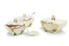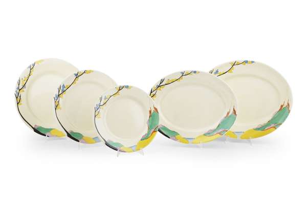 comprising 8 dinner plates; 8 fish plates; 8 side plates; a gravy boat; a large oval serving dish, 43cm across; two smaller oval serving dishes; a 'Biarritz' vegetable dish and cover, 19cm across; and a pair of 'Biarritz' sauce dishes and covers, each with original ladle, 15.5cm across, painted in coloured enamels, printed factory marks (31 pieces)