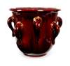 of cylindrical form with tapered base, the sides decorated with lugs, the whole covered in a sang de boeuf glaze, impressed factory marks