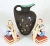 modelled as two female bathers, impressed marks, 15cm high; an ITALIAN 1950S JUG, enamelled with street scene, 22.5cm high (2)