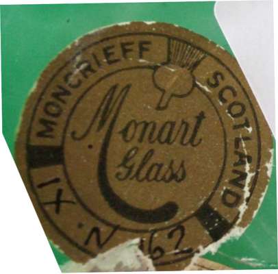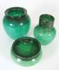 the green body with amethyst and aventurine inclusions to the rim, 17cm high; also a MONART GLASS VASE, N SHAPE, the green body with amethyst and aventurine inclusions to the rim, 16cm high; also a MONART GLASS POWDER JAR AND COVER, OB SHAPE, the green body with amethyst and aventurine inclusions to the rim, 11cm high (3)