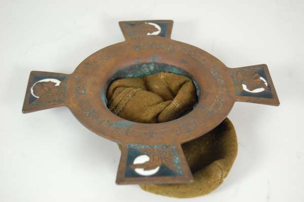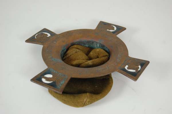 COPPER AND ENAMEL FRAMED COLLECTION BAG, CIRCA 1920