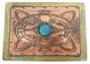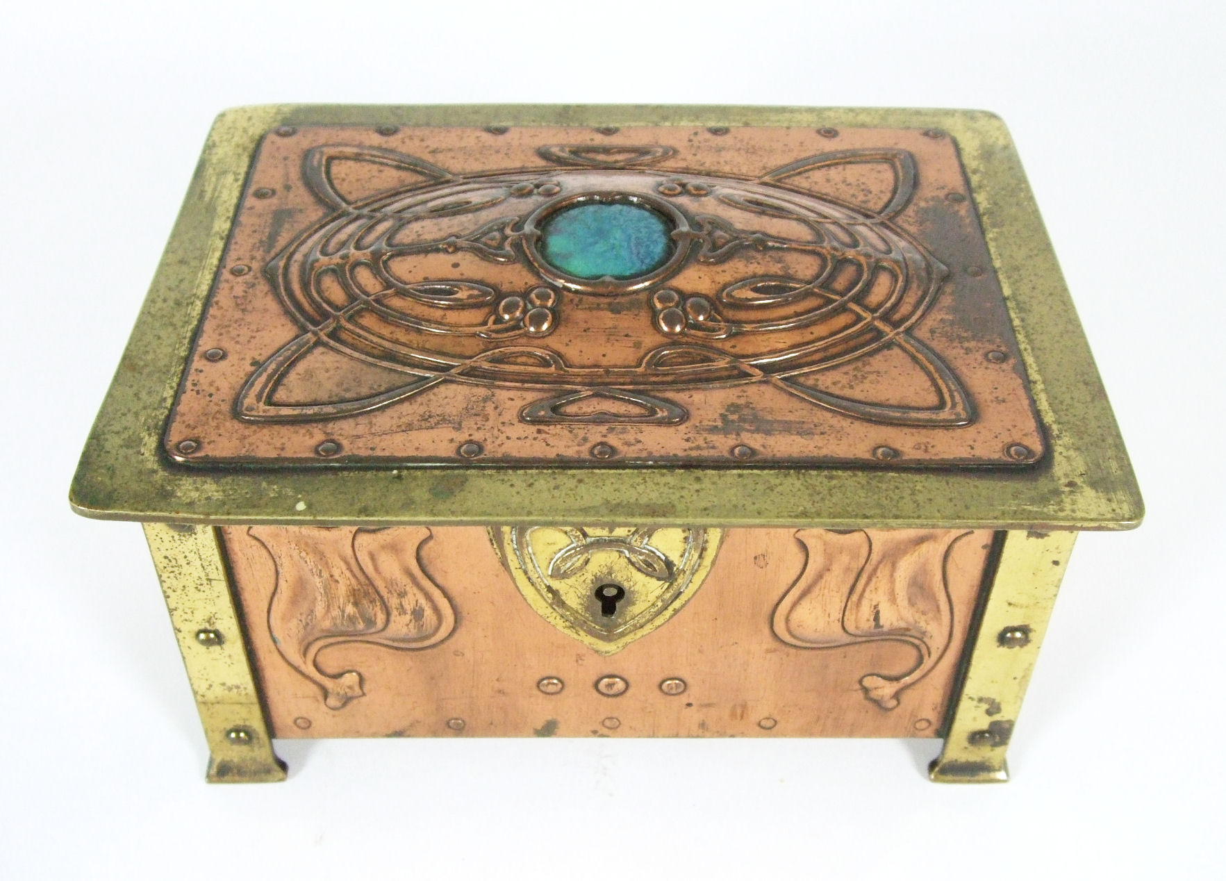 embossed with panels of whiplash foliage, the lid set with a Ruskin cabochon, stamped marks 'McVitie & Price/ London and Edinburgh'