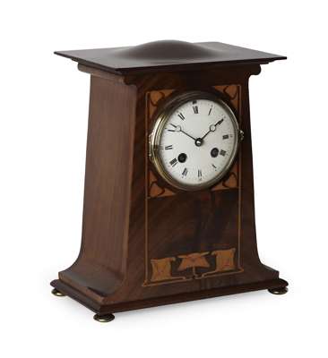 MAHOGANY AND MARQUETRY INLAID MANTEL CLOCK, CIRCA 1910