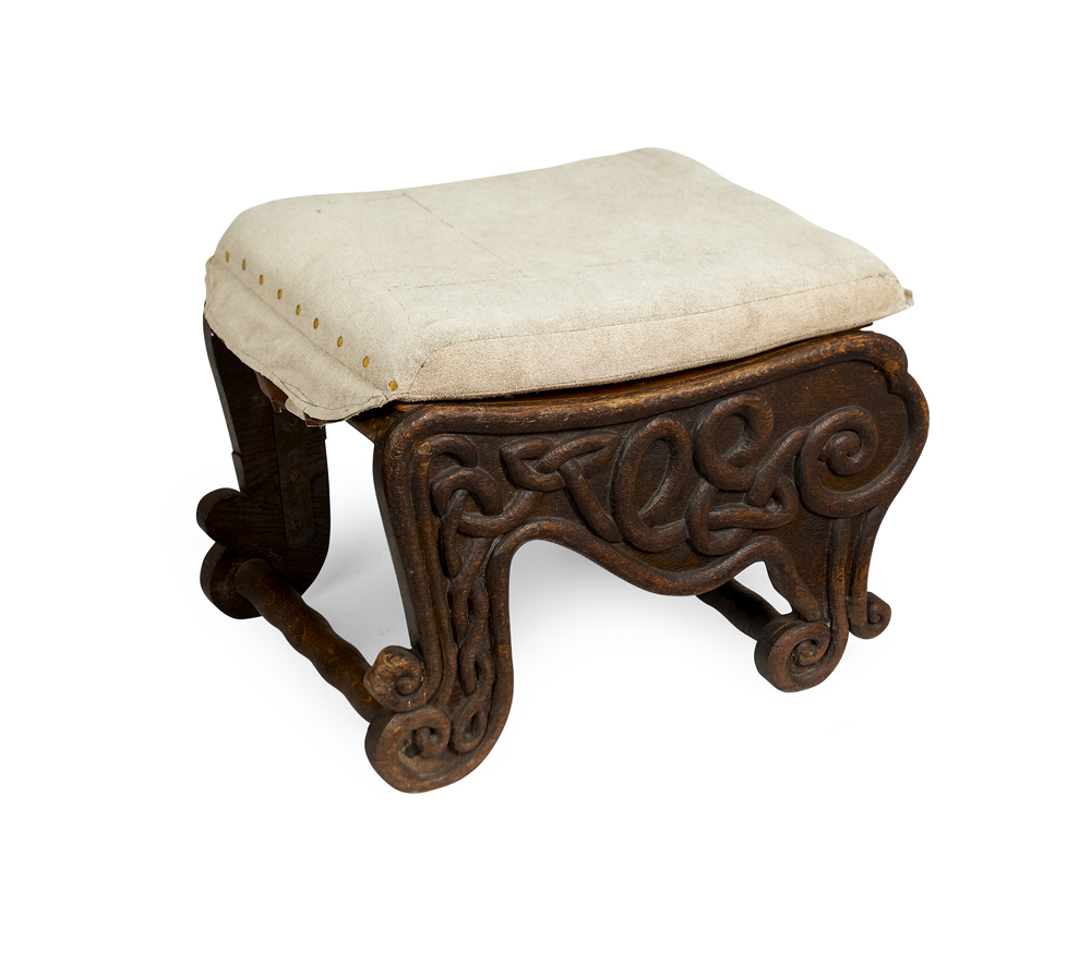 the leather upholstered pad seat above shaped apron carved in relief with Celtic knotwork on scrolling legs linked by stretcher