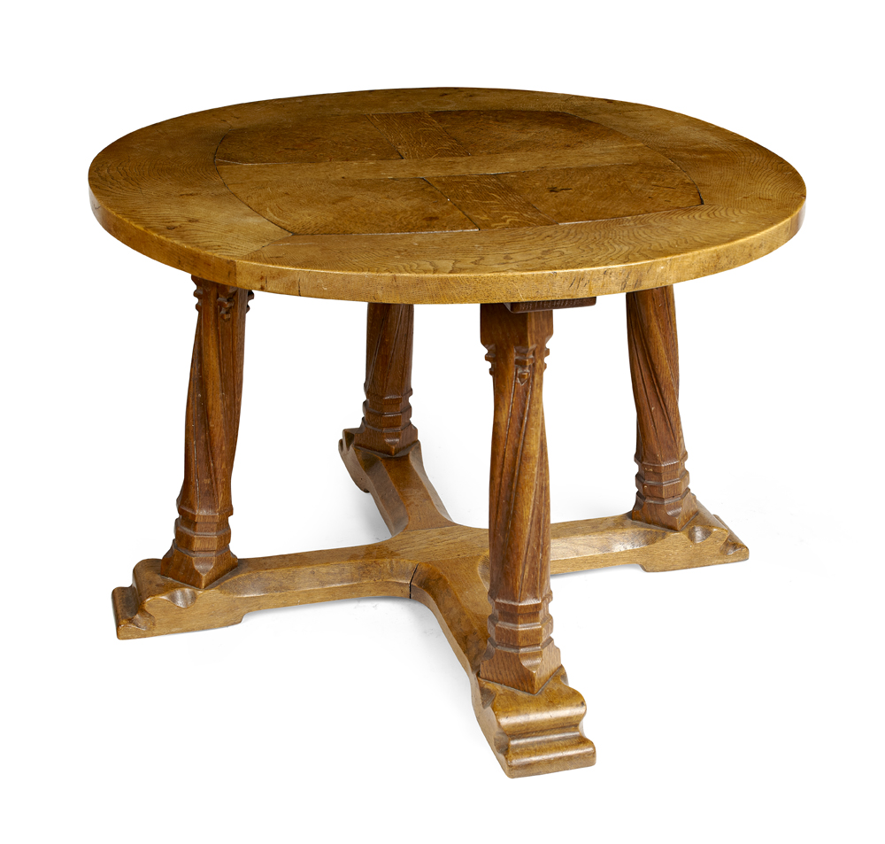 made by Whytock & Reid, Edinburgh, the circular planked top with four inset panels, raised on turned and spirally reeded and fluted moulded supports, on a crossed chamfered base with ogee moulded feet