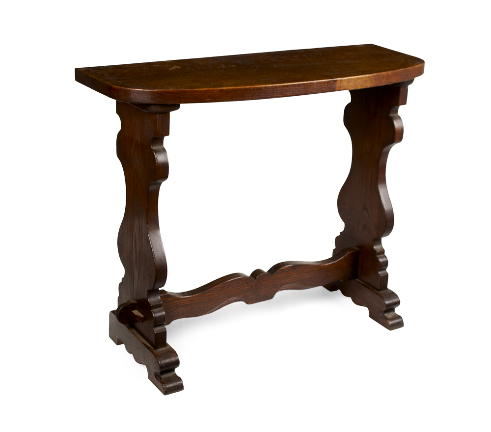 made by Whytock & Reid, Edinburgh, the demi-lune top on baluster cut-out supports linked by shaped pegged stretcher on bracket feet