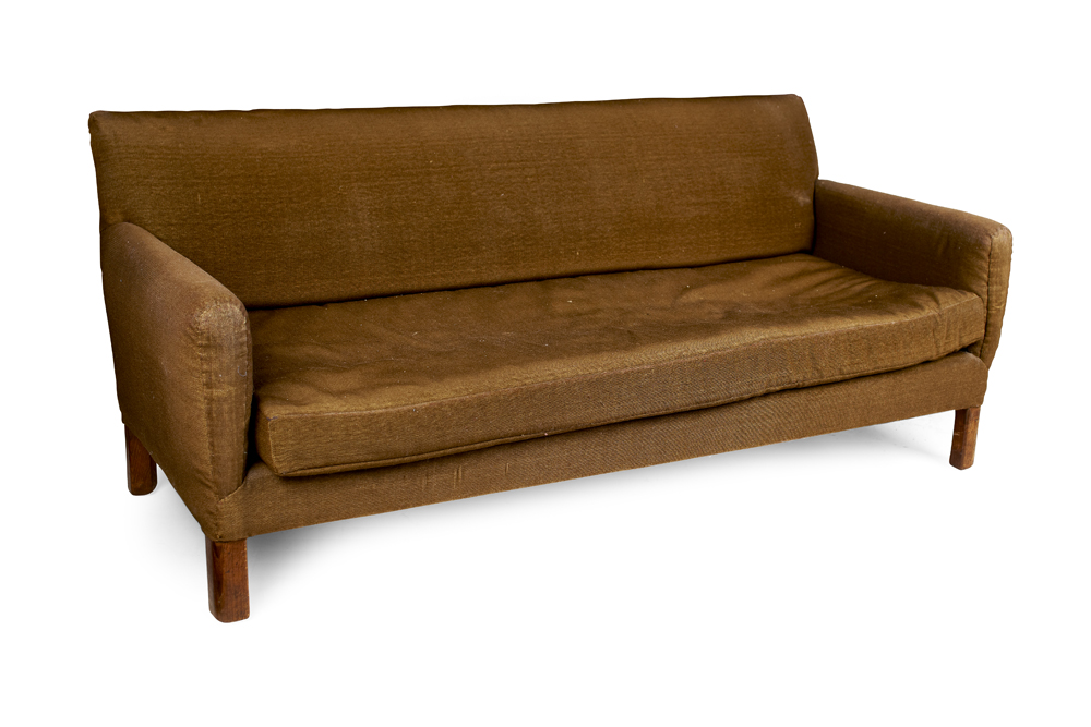made by Whytock & Reid, Edinburgh, the upholstered back and arms enclosing loose squab cushion raised on square rounded legs