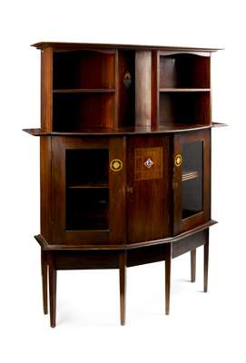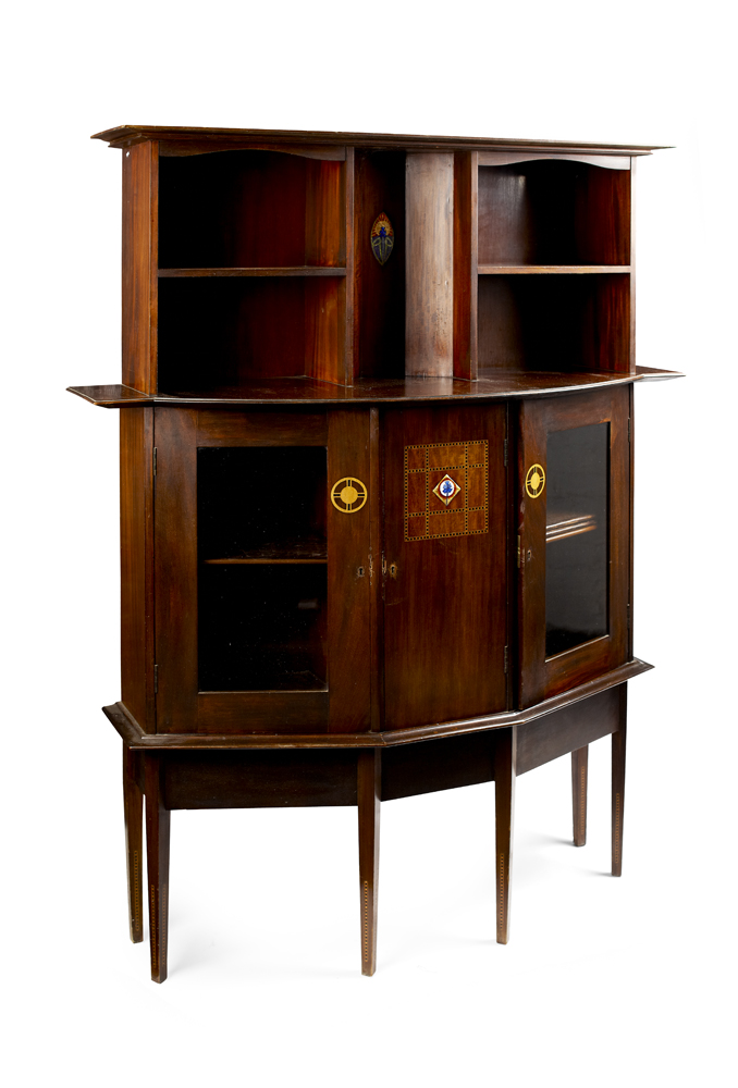 the projecting moulded cornice above a central alcove set with elliptical enamel plaque and flanked by open shelves, the semi-bode base with central inlaid door flanked by glazed cupboards, the whole raised on square tapered legs, bears maker's label