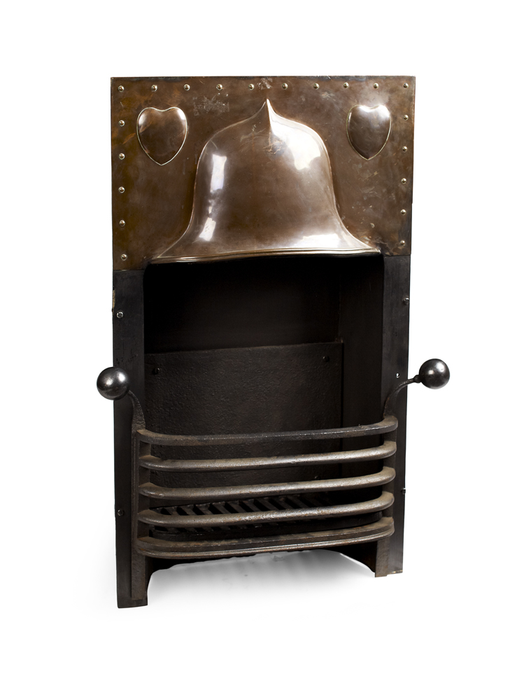 repoussé decorated with heart-shaped symbols and rivet design above a grate with horizontally ribbed guard and orbed fire dogs