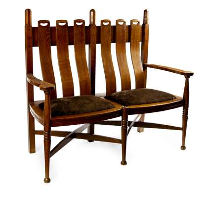the back with curved and pierced splats, and square supports with canted finials, above open arms and two drop-in upholstered pad seats, the whole raised on ring turned legs linked by cross stretchers