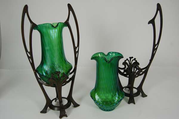 each green glass vase of shaped bottle form, with iridescent wash and latticed patterning, held in a bronze frame cast as stylised fruiting whiplash foliage, (one vase lacking one handle) (2)